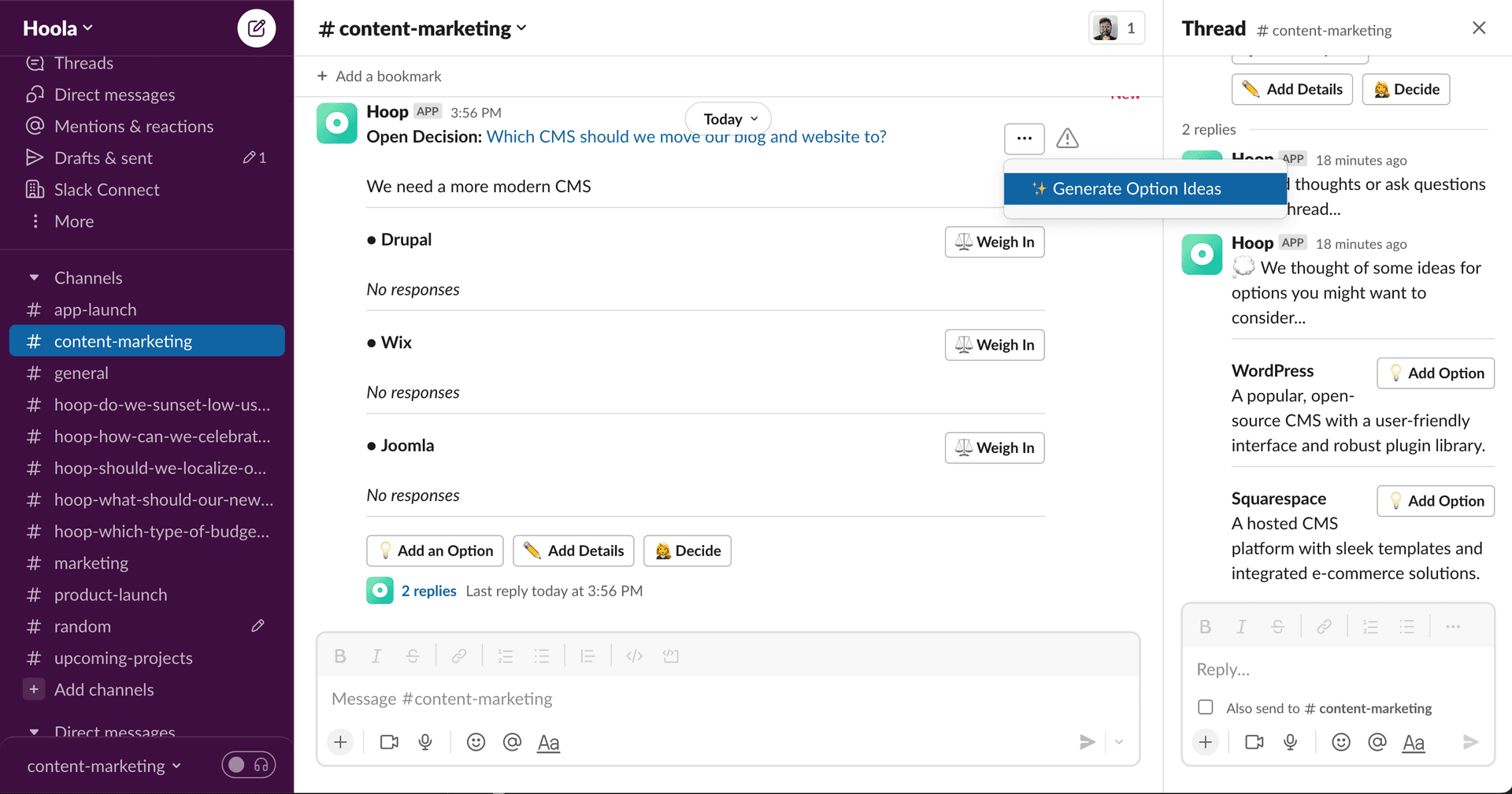 Building off of our recently released Hoop app for Slack, which allows teams to capture and create decisions right where the conversation is happening. HoopGPT makes it possible to instantly generate a list of options when creating decisions, thanks to an integration with OpenAI.