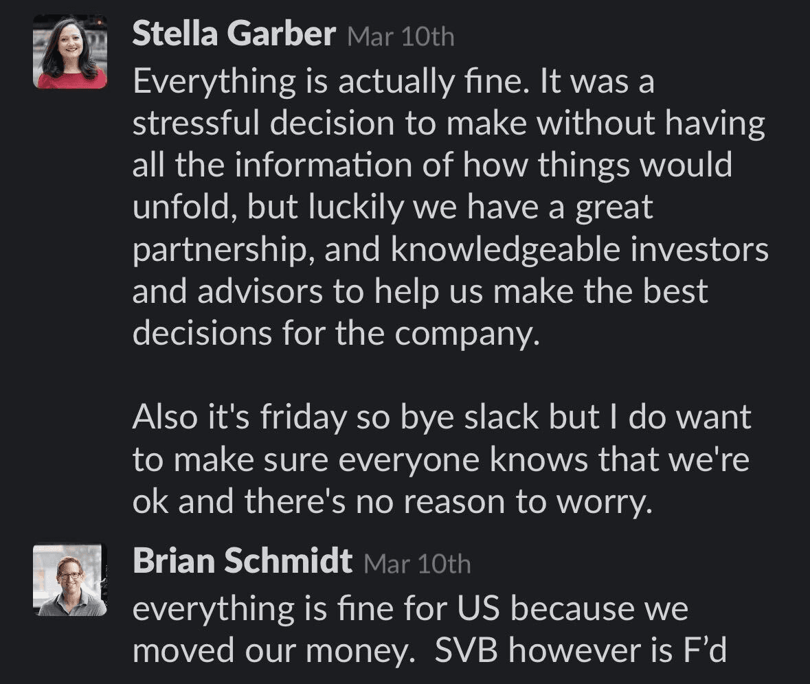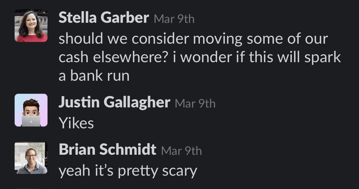 At 11:52 AM CST, my cofounder Brian posted an article in Slack about an issue at SVB. My heart rate went up, but not too much. Here’s the initial convo: