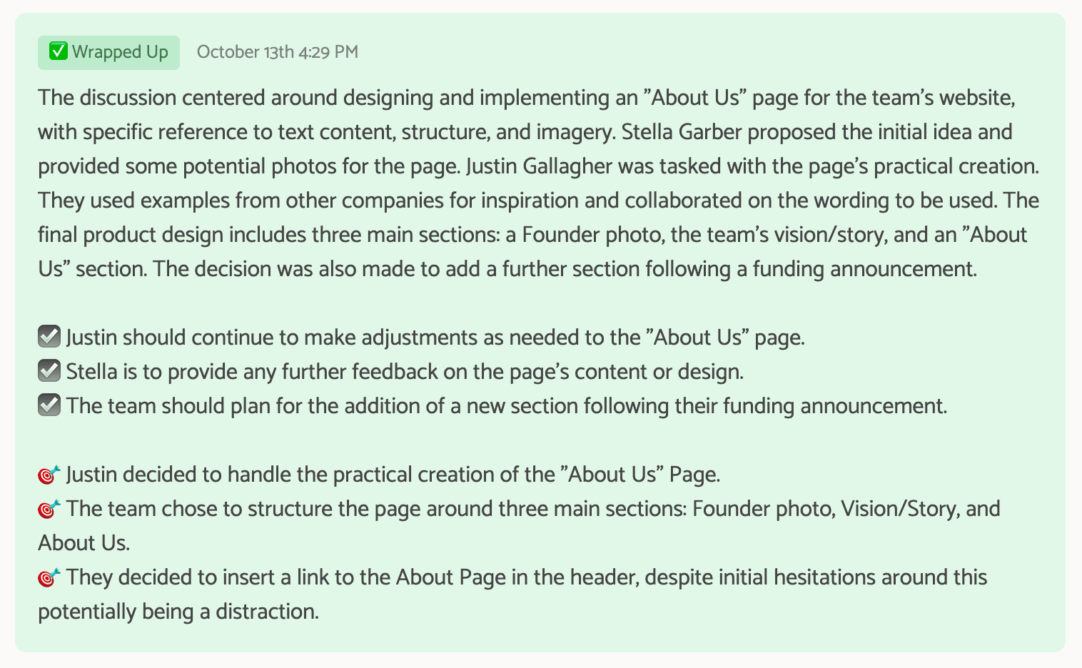 An AI auto-summary for a recent hoop about building an "About Us" page.