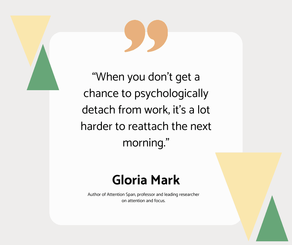 Modern ways of working are actually making it even harder for you to hone in on the work at hand, “Our devices allow us ubiquitous access to people and information. As a result many people work through the evenings, checking their phones throughout the night. People don’t get a chance to psychologically detach from work. When you don’t get a chance to psychologically detach from work, it’s a lot harder to reattach the next morning,” explains Gloria Mark, a professor and leading researcher on attention at University of California, Irvine.