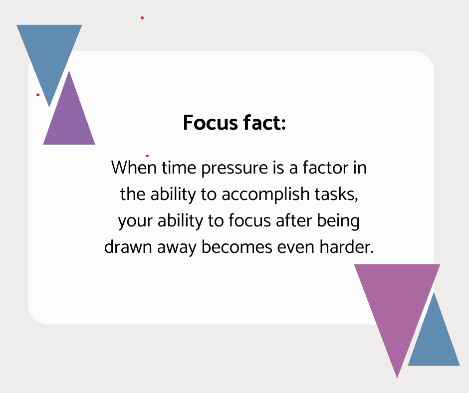 These results lead to the conclusion that when time pressure is a factor in the ability to accomplish tasks, your ability to focus after being drawn away becomes even harder.