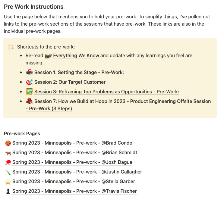 The way to make this happen for your offsite is through thoughtful pre-work. At this point in your preparation you’ve figured out an overall goal and laid out daily sessions. Those sessions need owners and the owners should think about whether the session should include pre-work. More often than not, pre-work is a helpful addition.