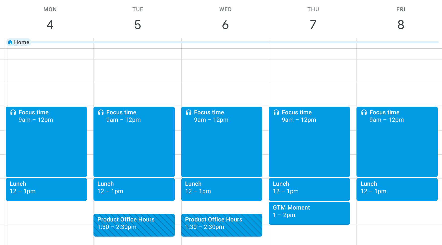 The biggest problem was that all of these new meetings were eating right into my focus time, or the core hours of the day when I am at my creative and productive best. The hours vary for everyone, but for me the sweet spot is from 10am until lunch around 1pm.