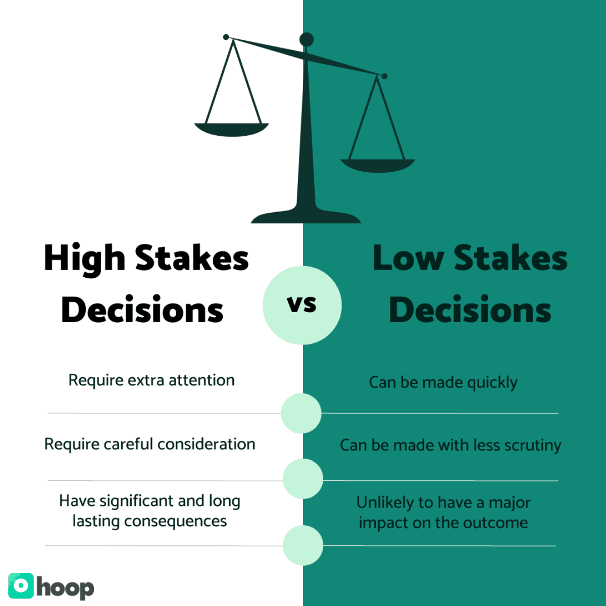 On the other hand, low stakes decisions can be made quickly and with less scrutiny. These are the decisions that are unlikely to have a major impact on the outcome, and therefore can be made with less time and energy.