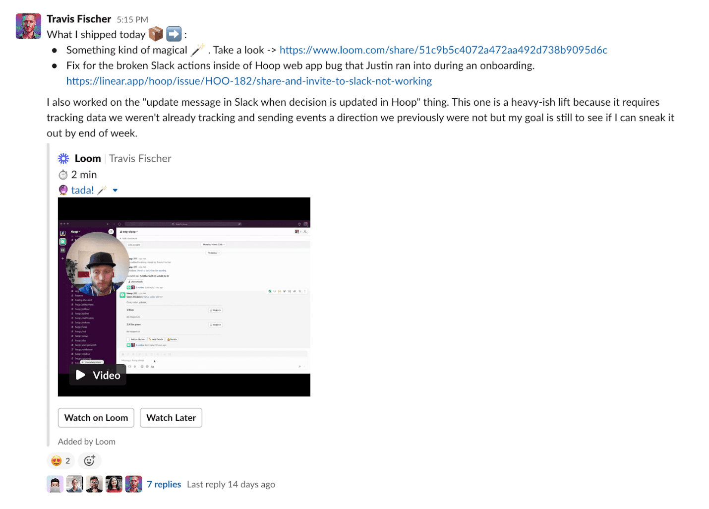 I make myself accountable to this cadence by posting a chat message at the end of each day title “What I shipped today 📦”.