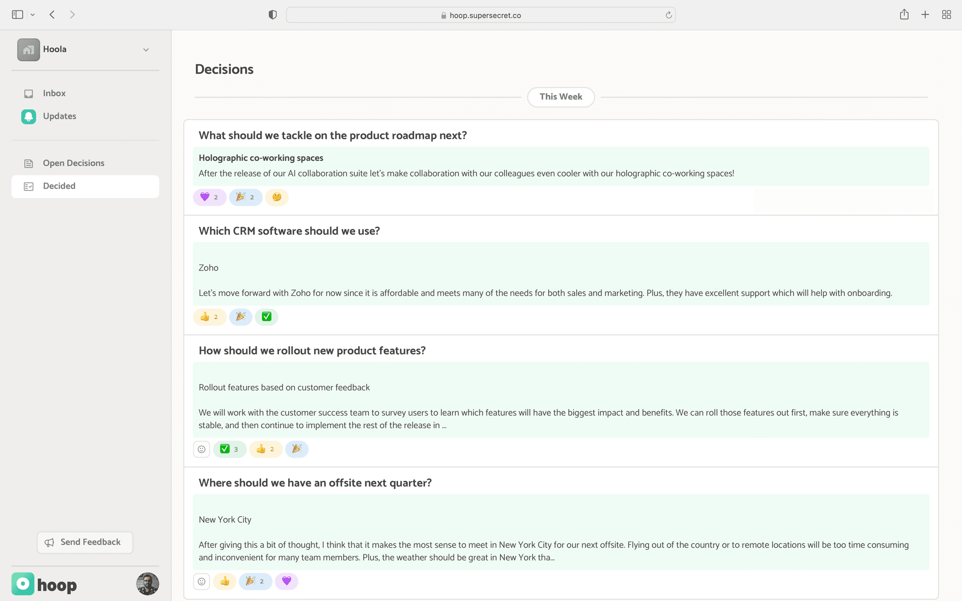 If you’d like to streamline your company’s decision making process, easily document and distribute decisions wherever work is happening, and build a decision log automatically then sign up for the Hoop waitlist today.